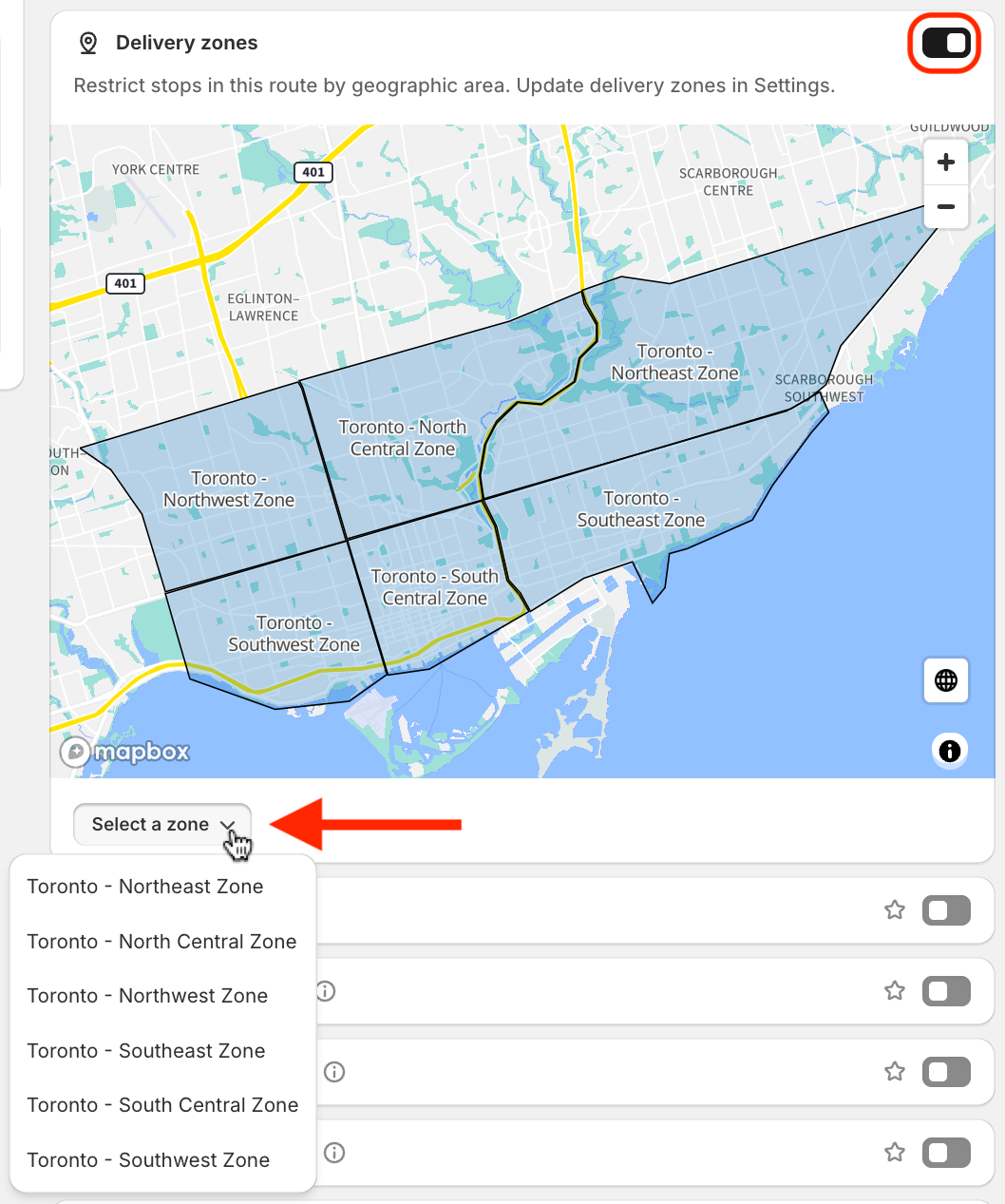 Once any zones are configured as described above, they'll be available to select from the Delivery zones Route Option, prior to creating any route. Click the toggle to activate this option, and select the zone for selecting orders from the dropdown below the map, then click the Save button at the top of the page: