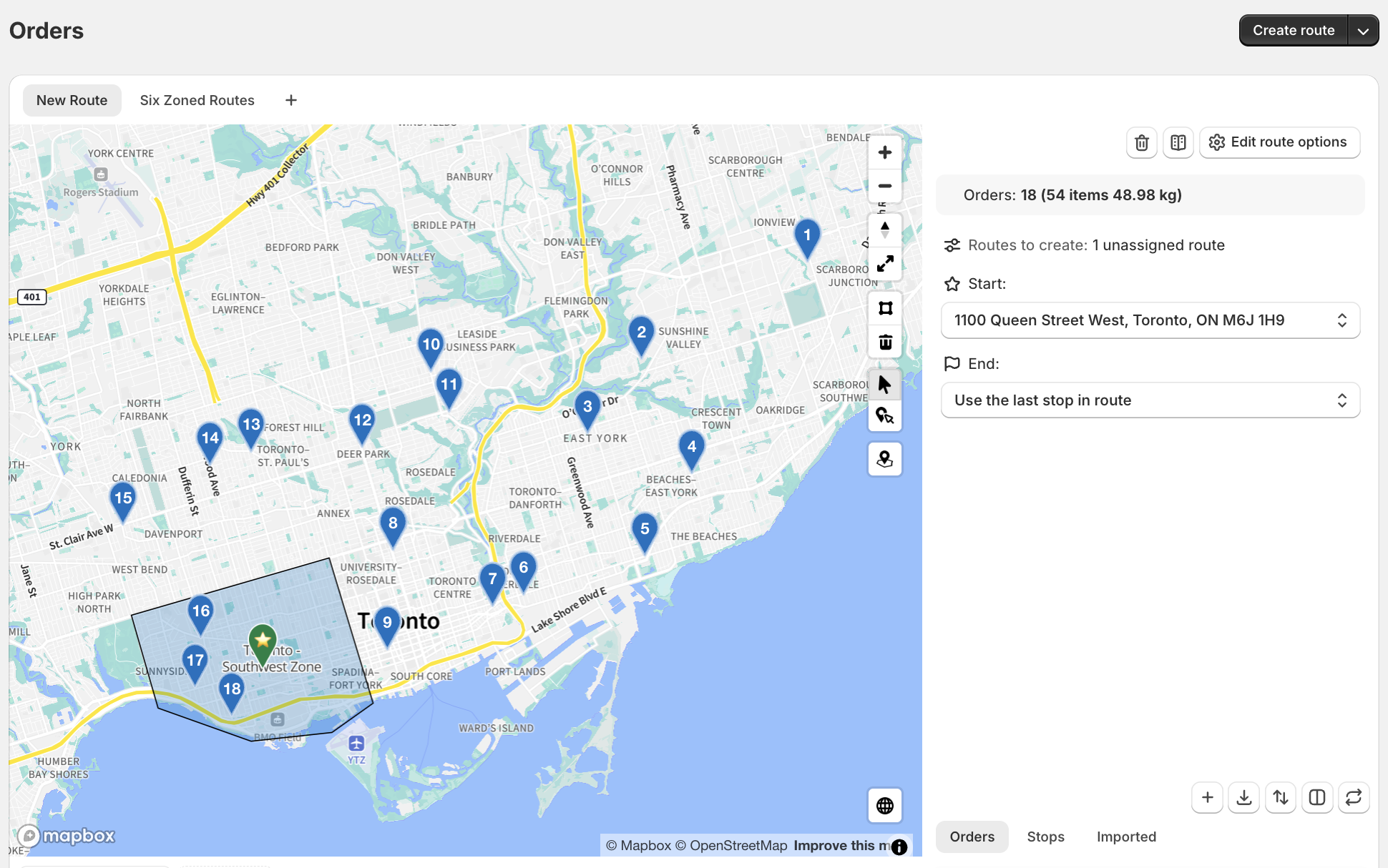 In this example, we've configured six different zones, and will be generating one route for each zone, containing all of the orders contained within each zone.