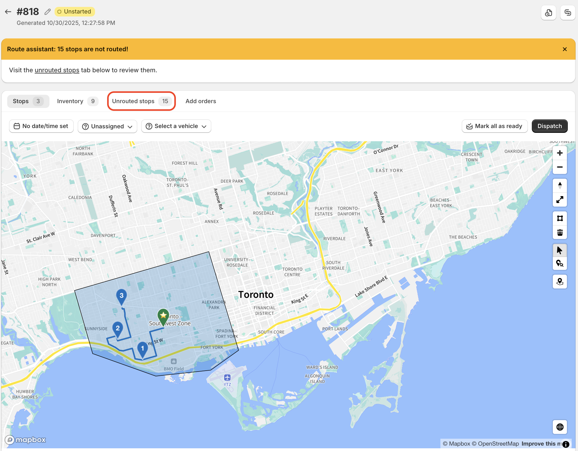 Click the Create route button in the upper right-hand corner of the page. A new route will be created with only the orders that fall within the active zone; any orders outside of the zone will be grouped in the Unrouted stops tab for further review: