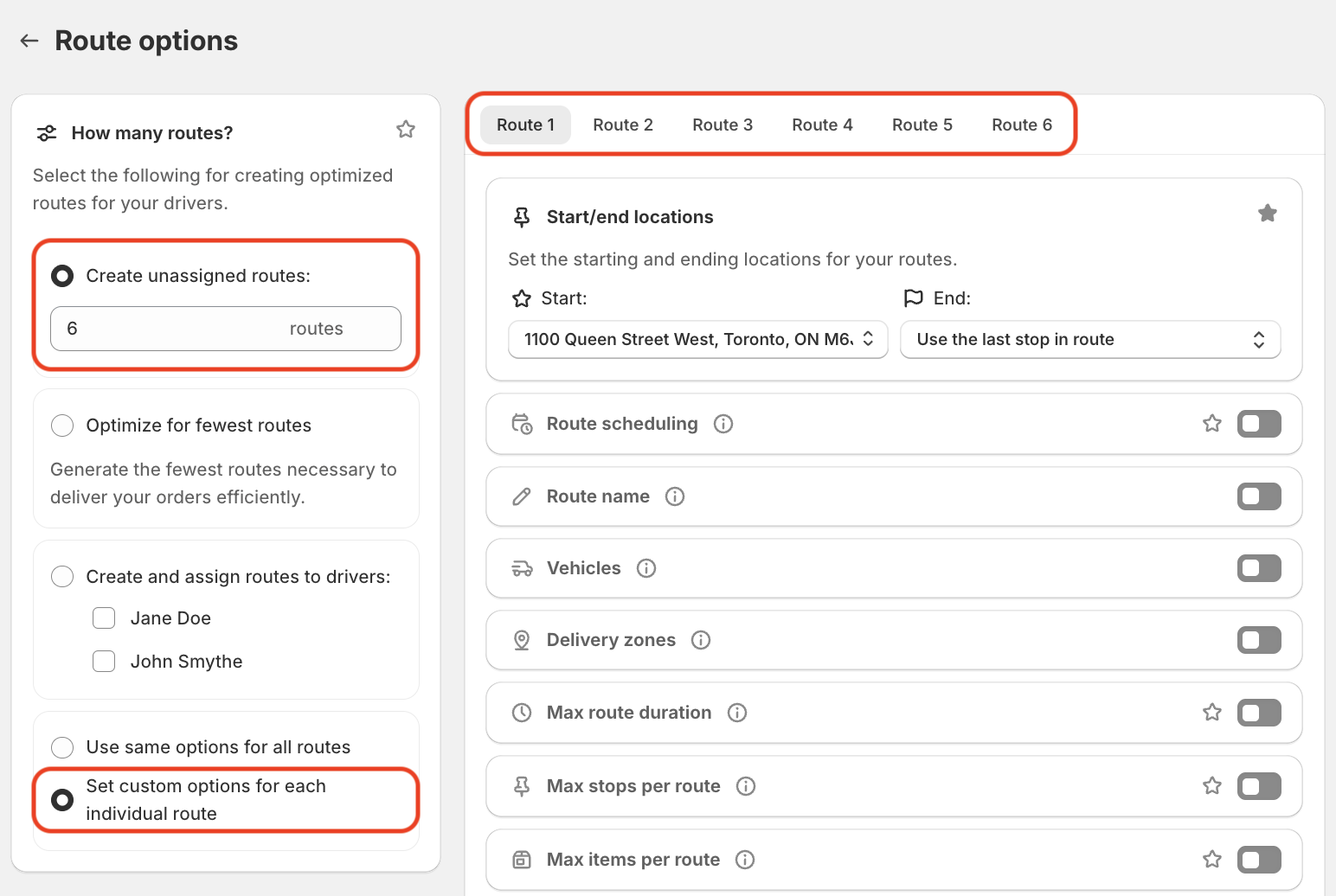 From the Route Options panel, modify the How many routes? option to create 6 routes; from the same option's panel, enable the Set custom options for each individual route setting, which will enable six different route option tabs as shown below: