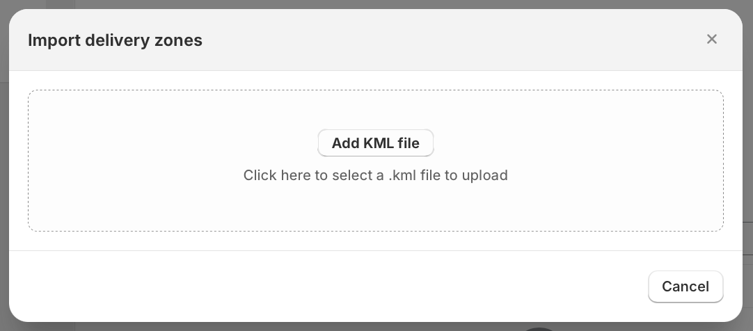Drag and drop your .KML file onto the import modal, or click the Add KML file button to select a file from your device: