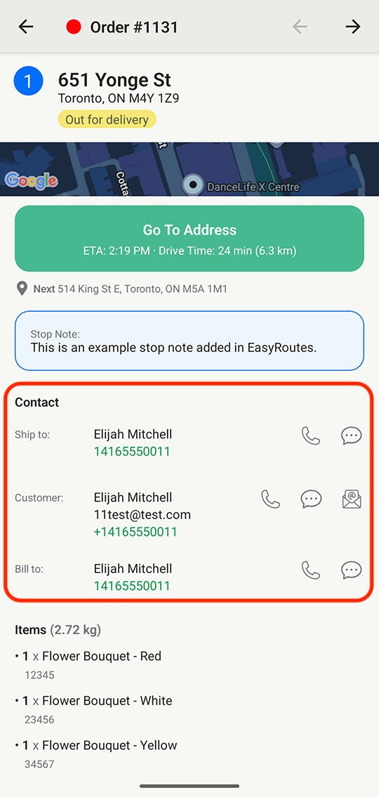 EasyRoutes Delivery Driver displays customer and shipping contact information so that you can perform your deliveries correctly.