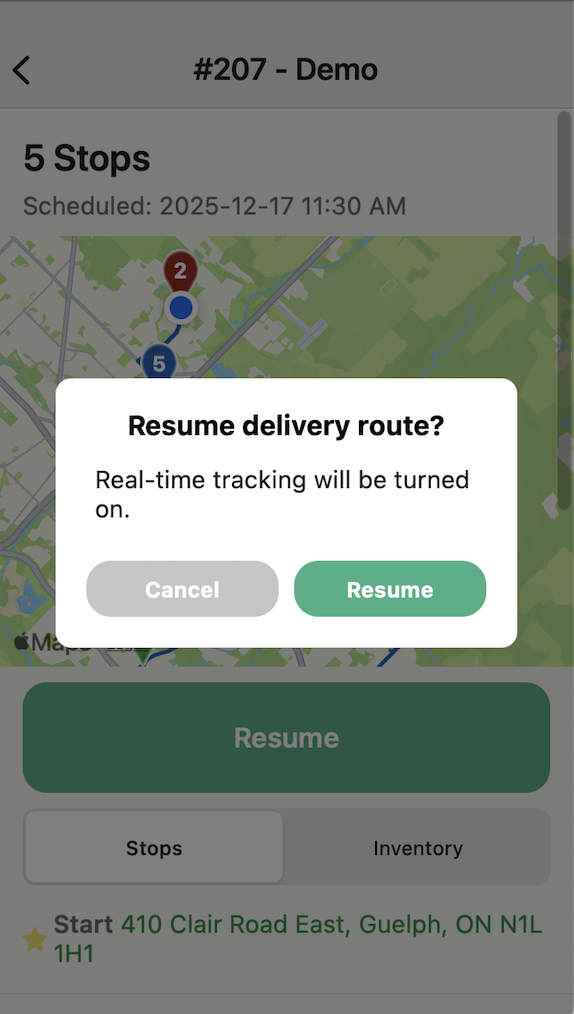 Real-time tracking will resume once you click 'Resume' and you can complete the rest of the route.