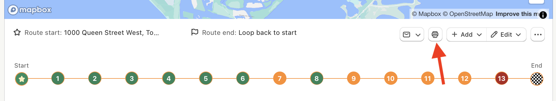 For routes created as part of a route group, you can print all routes included in that group at once by navigating to the All routes page for that group (using the arrows or menu in the top-right corner when viewing any route within the group) before clicking the Print button below the map: